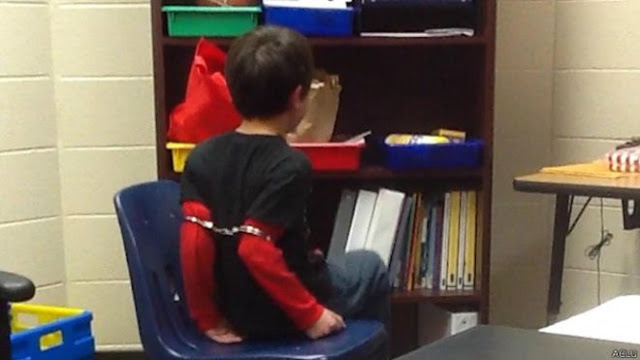 Um vídeo mostra um menino de oito anos algemado e a chorar numa escola do Kentucky, lá no país dos cowboys!